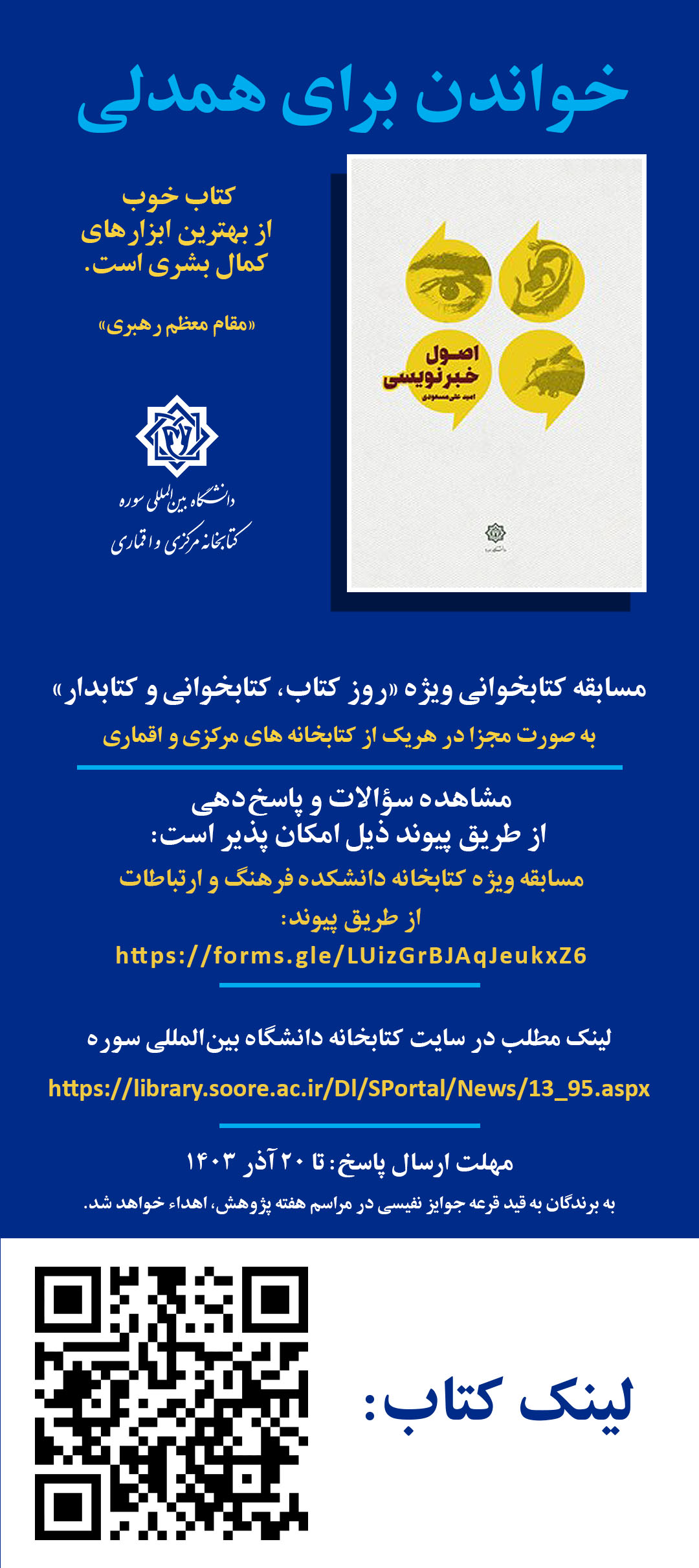 مسابقه كتاب خواني از روز كتاب، كتابخواني و كتابدار تا روز پژوهش ويژه تمامي استادان و دانشجويان دانشگاه بين المللي دانشگاه سوره
